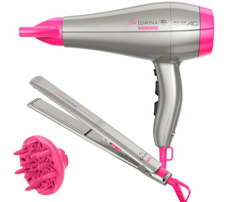 O kit New Lumina conta com uma prancha super adaptada para o uso no dia-a-dia, com um design e cores surpreendentes, o kit conta com um secador de alta potência - 2.200W e tanto a prancha, quanto o secador
