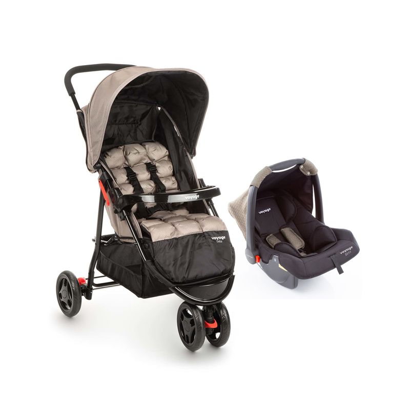 O conjunto é composto pelo carrinho Delta e bebê conforto Beta. O carrinho tem três rodas, super moderno. Já o bebê conforto Beta tem estrutura leve que facilita o transporte e a instalação no veículo