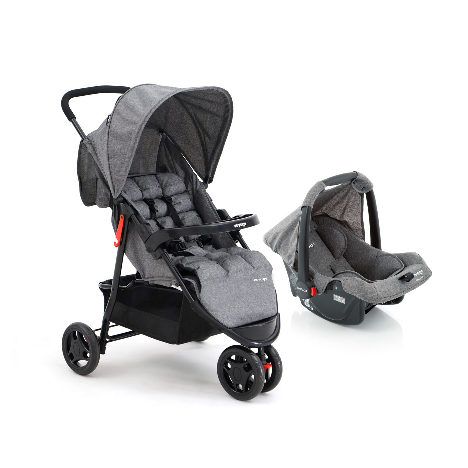 O conjunto é composto pelo carrinho Delta e bebê conforto Beta. O carrinho tem três rodas, super moderno. Já o bebê conforto Beta tem estrutura leve que facilita o transporte e a instalação no veículo
