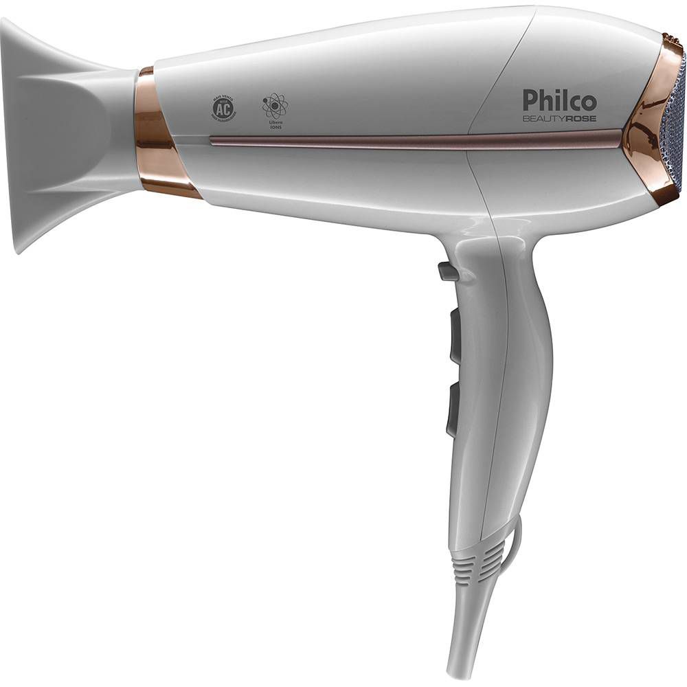 O Secador de Cabelos Beauty Rose 2 Velocidades Philco tem motor AC, trazendo para o seu dia a dia o efeito do salão!É tourmaline íons, ou seja, libera cargas elétricas negativas que neutralizam a eletricidade estática dos cabelos auxiliando no fechamento da cutícula dos fios.Tem 2000W de potência, 2 velocidades e 3 opções de temperaturas, atendendo a todas as necessidades;Além de oferecer bocal concentrador, bocal difusor e bocal para secagem rápida, perfeitos para secar e criar penteados, dando volume rapidamente;E para sua maior comodidade, possui cordão elétrico com 3 metros e anel para pendurar, opção para acomodar em local disponível para uso.