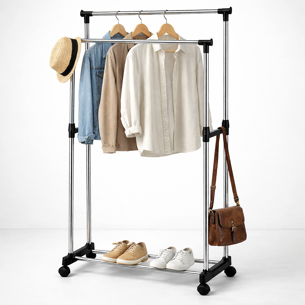 Seu sistema de altura ajustável permite acomodar desde peças curtas até roupas mais longas, oferecendo versatilidade para diferentes necessidades. Além disso, conta com sapateira inferior para melhor aproveitamento do espaço e rodinhas com giro 360° e travas, facilitando a movimentação entre ambientes.
